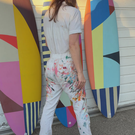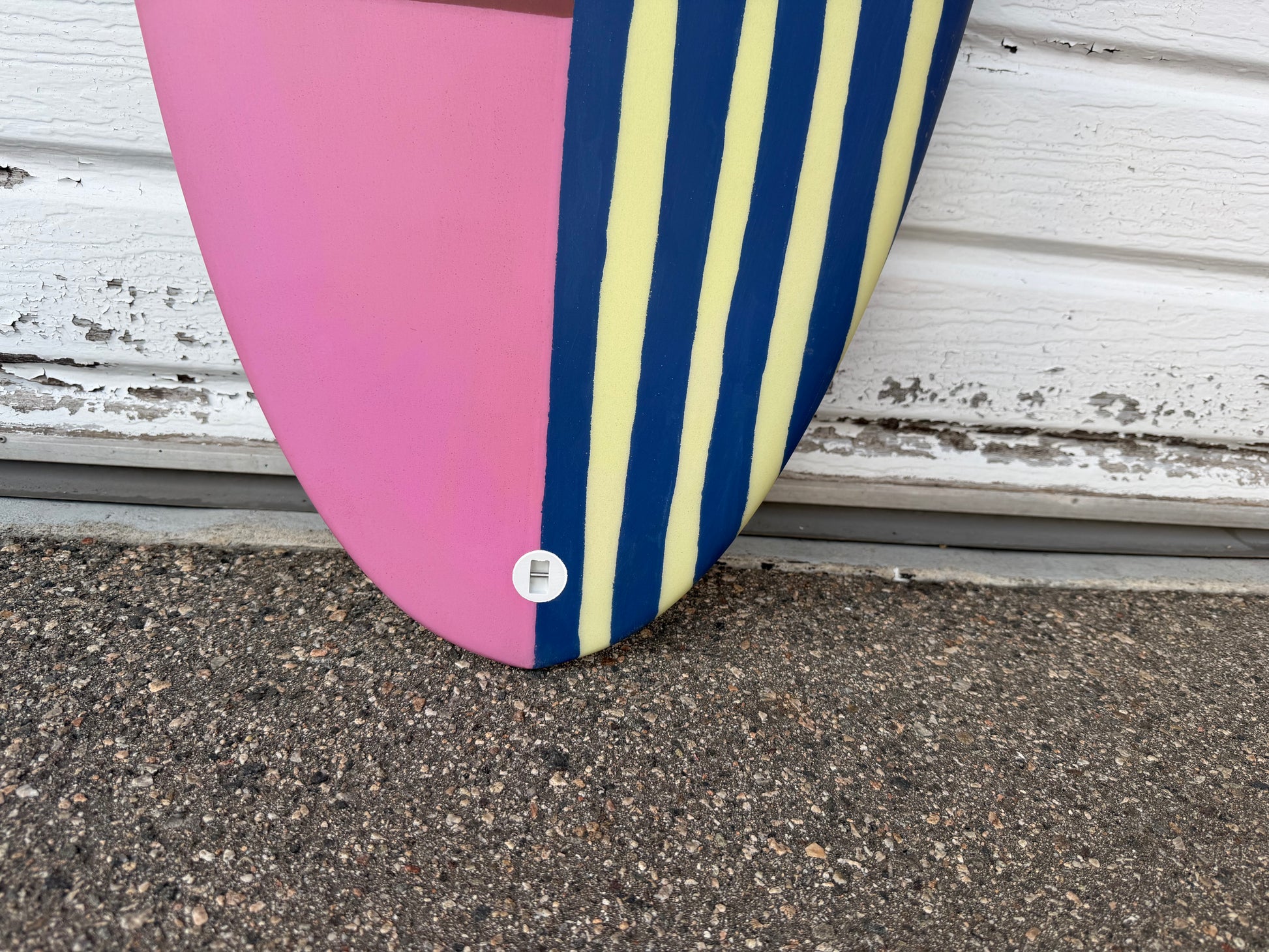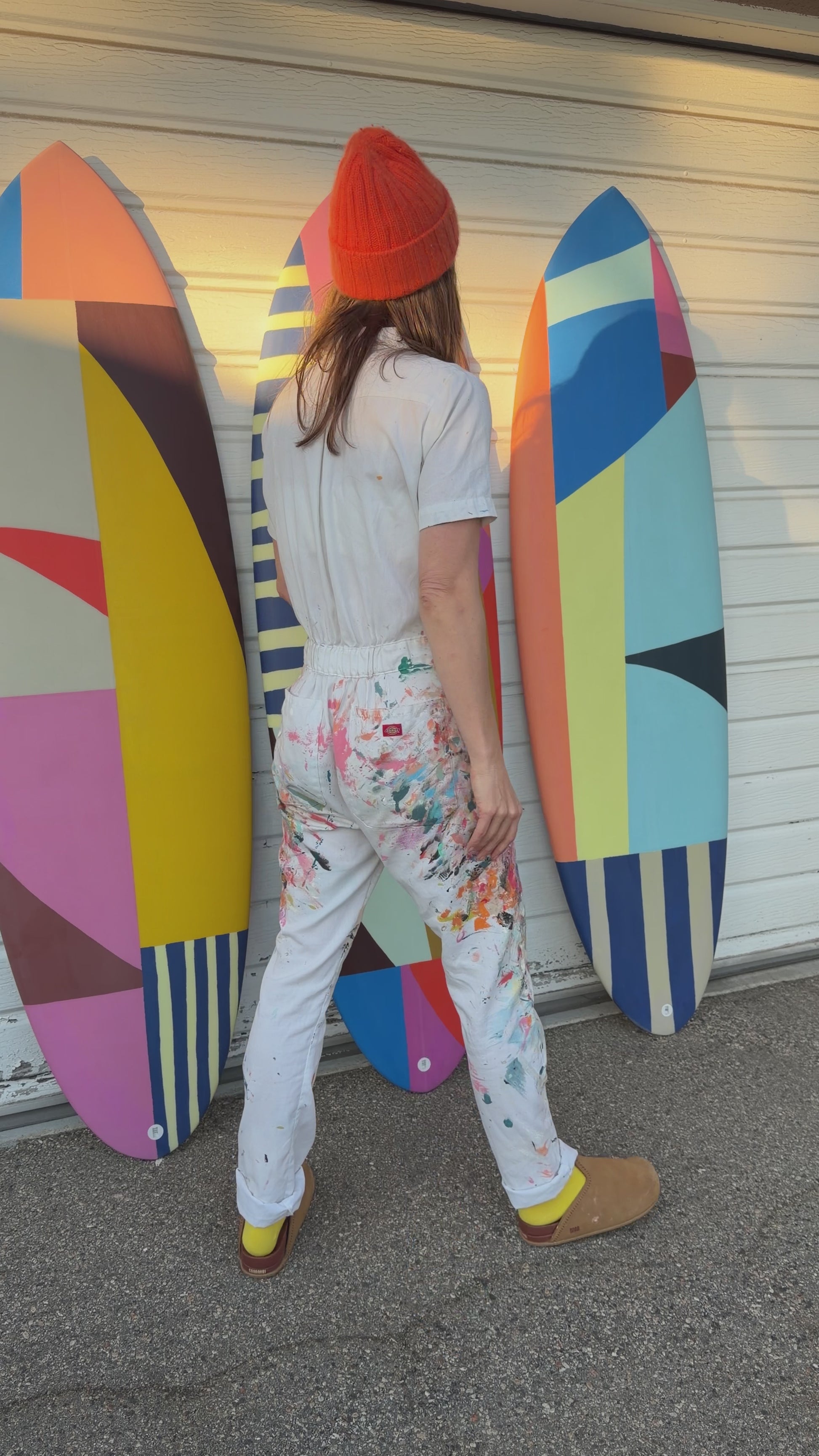 Price is for 1 board. One-of-a-kind surfboard hand painted by Erin Miller Wray and shaped by Pure Glass. This limited edition, board is designed intentionally to double as art for your home or wall as well as a 100% shreddable surfboard. Featuring a custom color palette and original design, each board measures 6'. The boards are "Egg" shaped, created by hand from Pure Glass in Costa Mesa, CA. The Egg is a fun and easy to ride board for surfers of all skill levels.